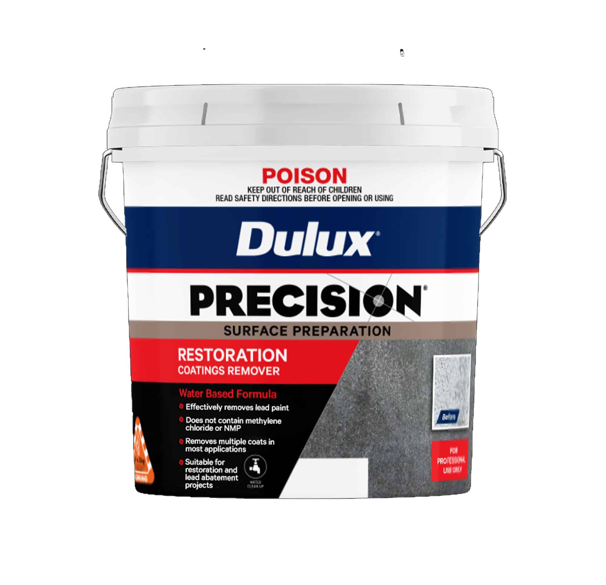 Dulux PRECISION® Restoration Coatings Remover is a water-based product, which is effective for removing multiple layers of architectural and industrial coatings from interior and exterior surfaces.