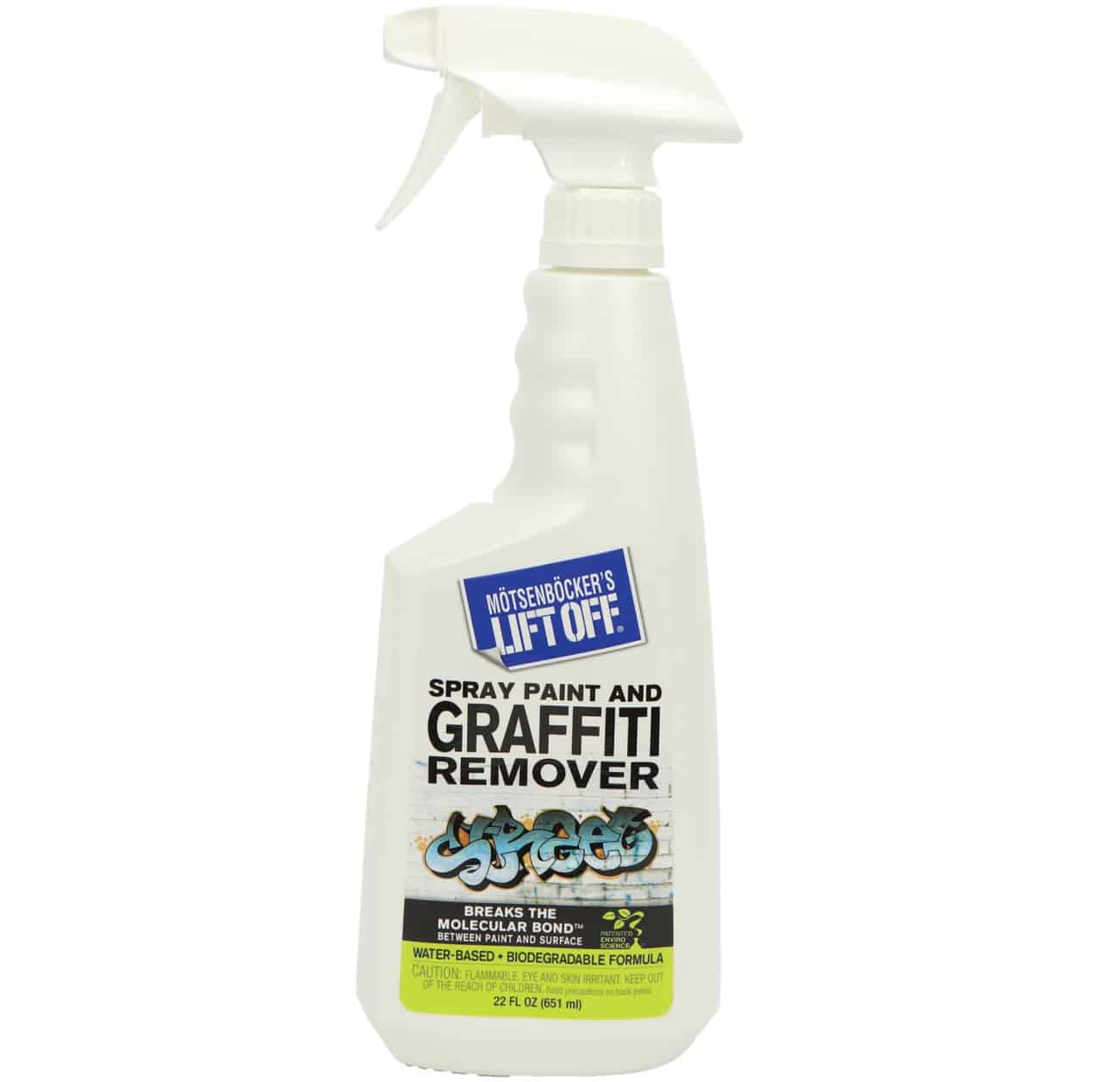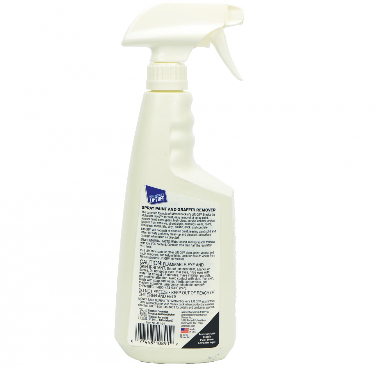 The patented formula of Motsenbocker’s Lift Off® Breaks the Molecular Bond™ for fast, easy removal of spray paint, aerosol paint, semi-gloss, high-gloss, acrylic, enamel, and oil lacquer from vehicles, street signs, buildings, walls, floors, fiberglass, metal, tile, vinyl, plastic, brick, and concrete.