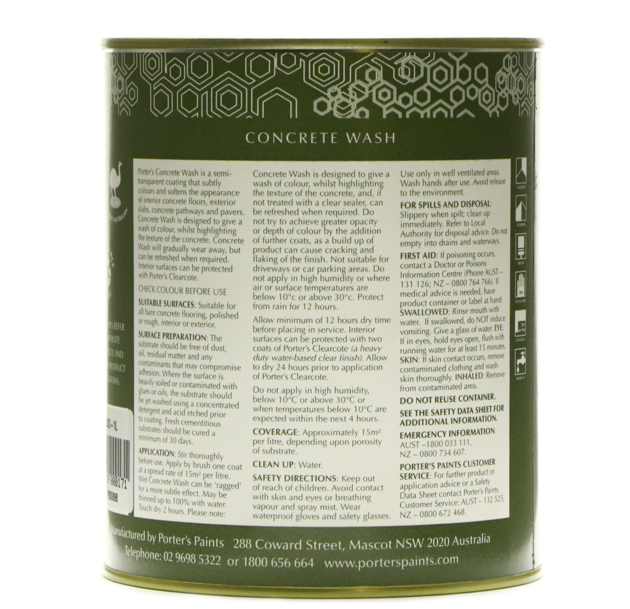 Porter’s Concrete Wash is a translucent coating that subtly colours and softens the appearance of interior concrete floors, exterior slabs, concrete pathways and pavers. Concrete Wash is designed to give a wash of colour, as intense or as subtle as you like, whilst highlighting the texture of the concrete. If required, can be protected with Porter’s Clearcote on interior surfaces. If not treated with Porter’s Clearcote, will gradually wear away, but can be refreshed when required.