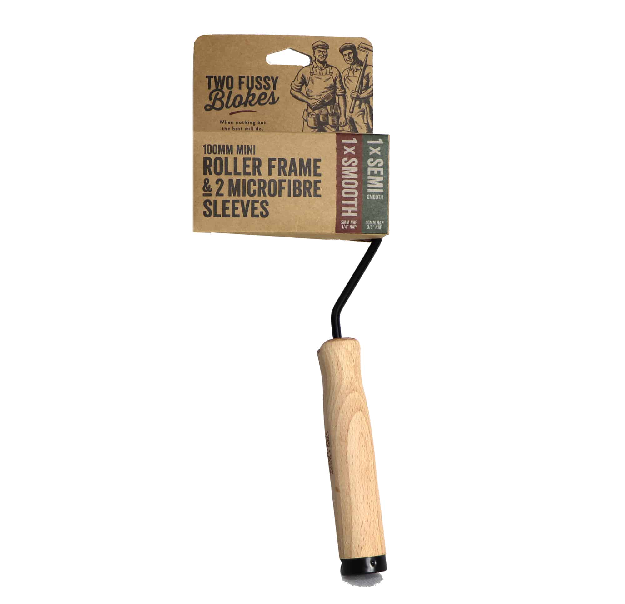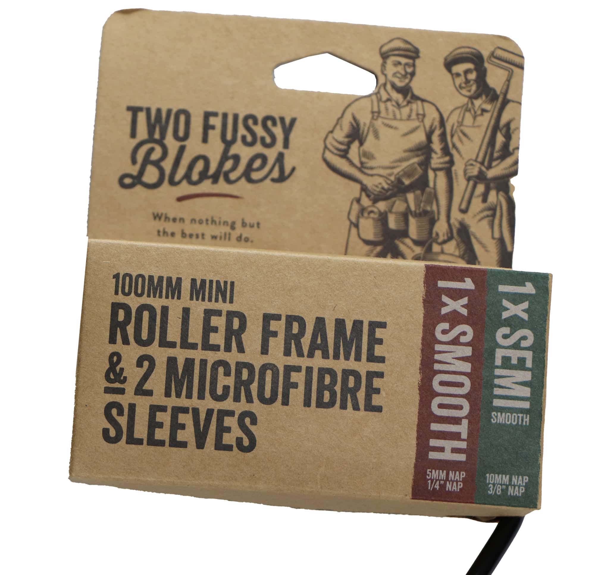 The Two Fussy Blokes Covers and Frame is a compact roller set built for tight spaces and detailed work. It includes two mini roller covers (a smooth 5 mm nap and a semi‑smooth 10 mm nap) plus a mini frame. This combination helps you paint smaller surfaces cleanly and with control.